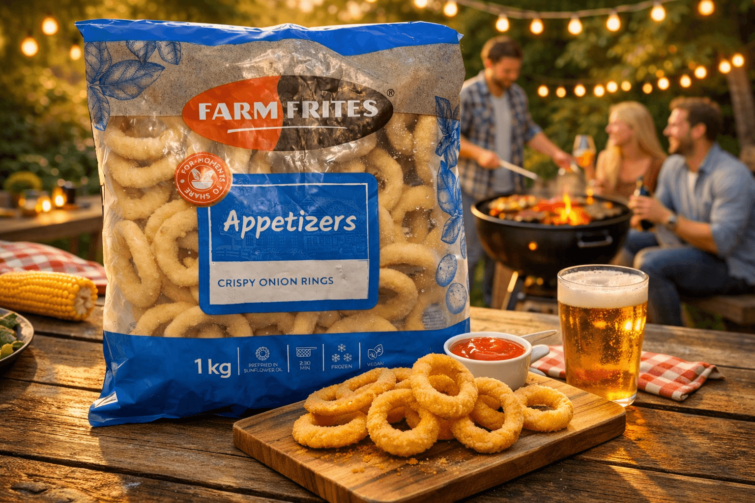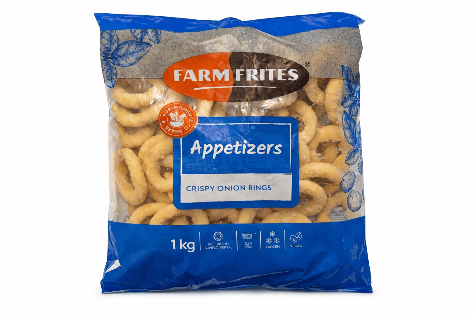 Krążki cebulowe Farm Frites Appetizers to popularna przekąska przygotowana z kawałków prawdziwej cebuli (53%) otoczonych chrupiącą panierką. Po przygotowaniu uzyskują złocisty kolor oraz charakterystyczną lekką i chrupiącą strukturę, a wnętrze pozostaje delikatne i lekko słodkie dzięki naturalnej cebuli.