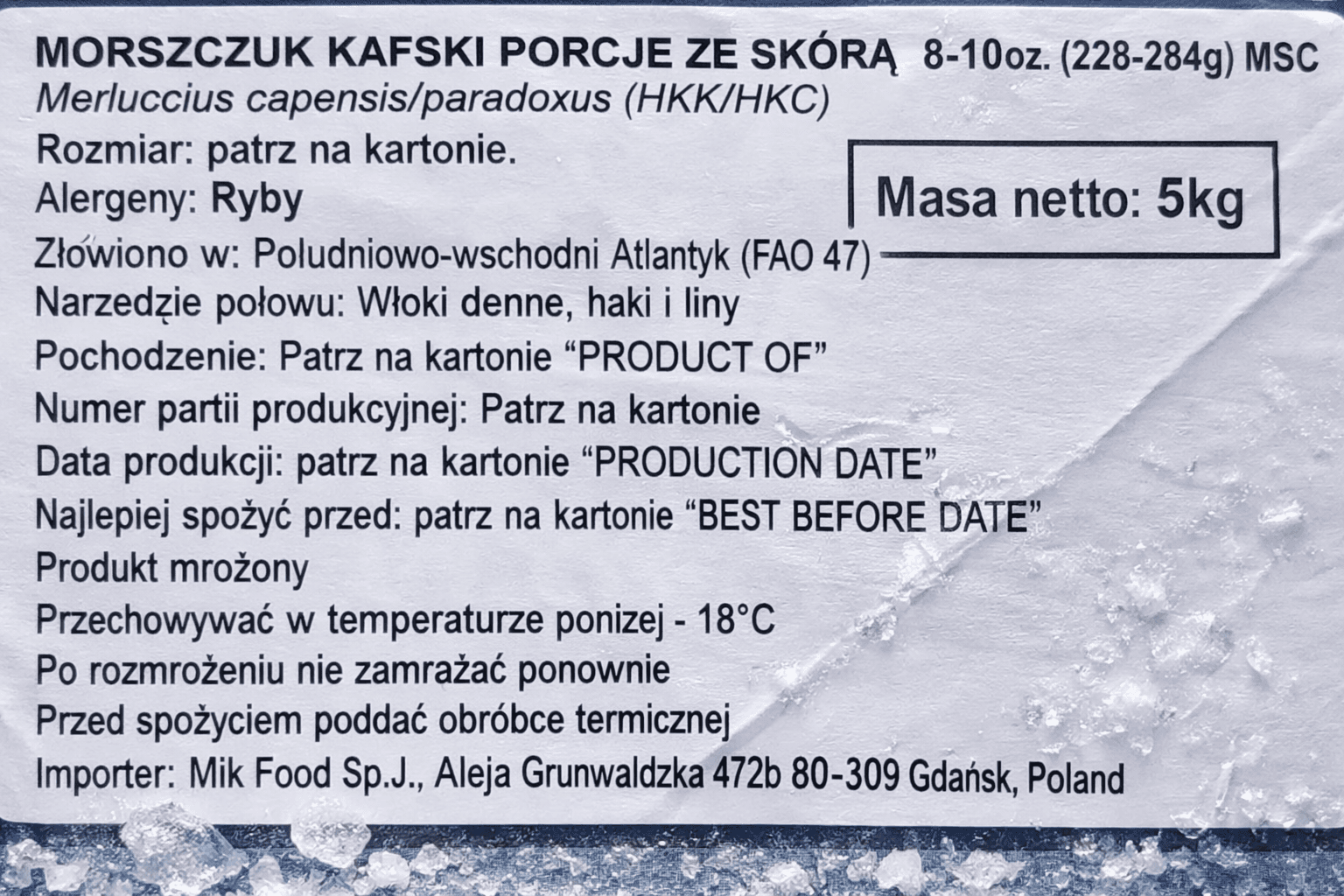 Duże opakowanie 5 kg to rozwiązanie ekonomiczne, szczególnie dla rodzin oraz osób regularnie przygotowujących dania rybne. Dzięki głębokiemu mrożeniu produkt zachowuje świeżość i wartości odżywcze przez długi czas.
